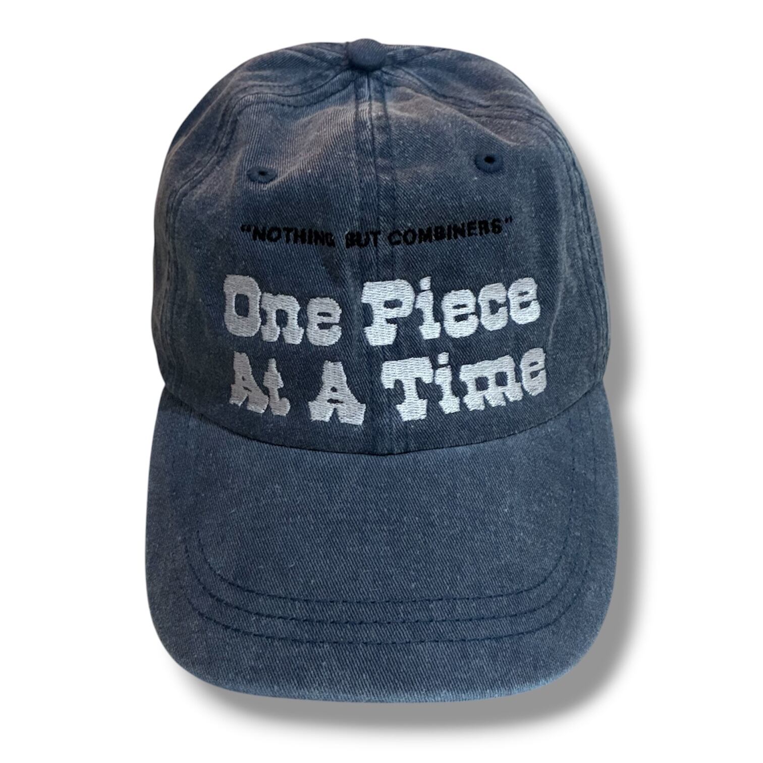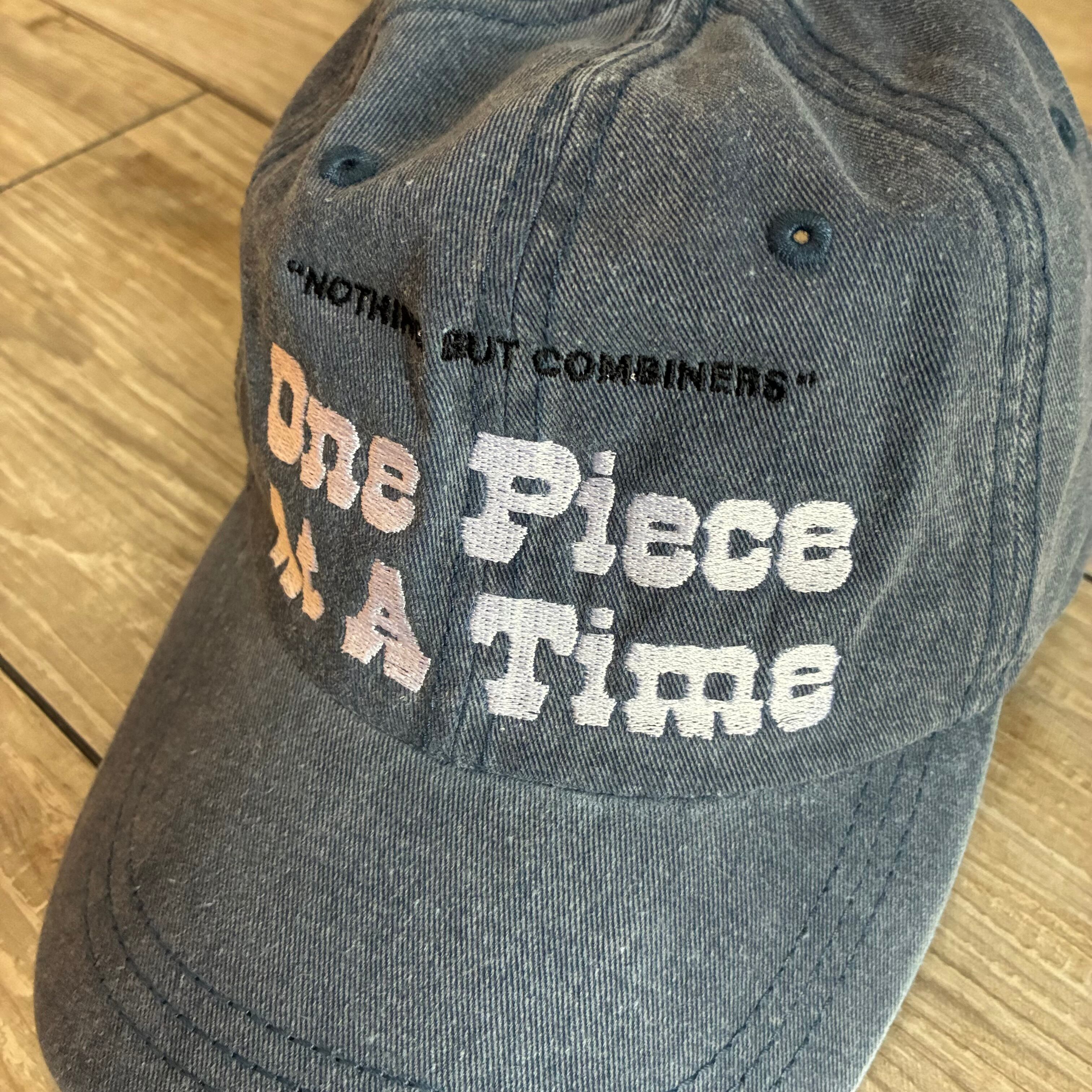 - テキスト: "One Piece At A Time"と"NOTHING BUT COMBINERS"の刺繍